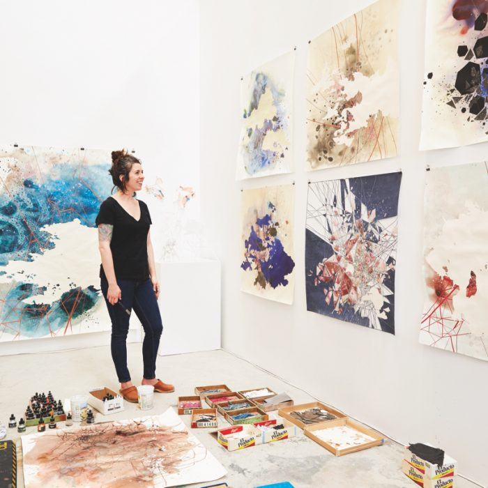 Inspired by cartography, her paper collage paintings and installations imagine an expressionistic take on the open road, conflating highways and constellations. “I like to tease out the language of maps and interpret it in my own hand,” says Britton.