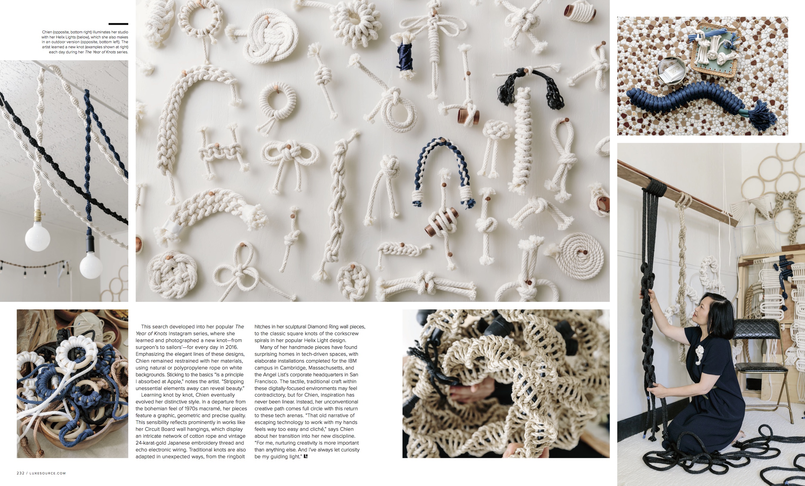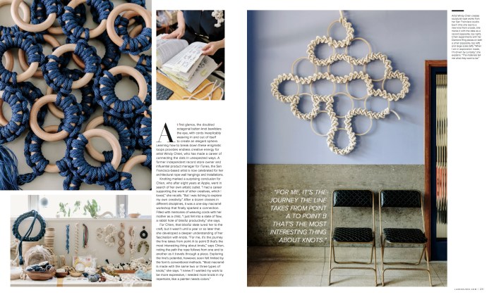 Once an iconic fixture of 1970s decor, macrame jumps by creative leaps and bounds in the work of San Francisco-based artist Windy Chien. Diving deep into the storied history of knotting techniques, Chien expands macrame’s traditional repertoire to create her uniquely sculptural forms. She chronicled this exploration in her popular Instagram account, @theyearofknots, displaying a photo of new knot every day in 2016. Read more here.