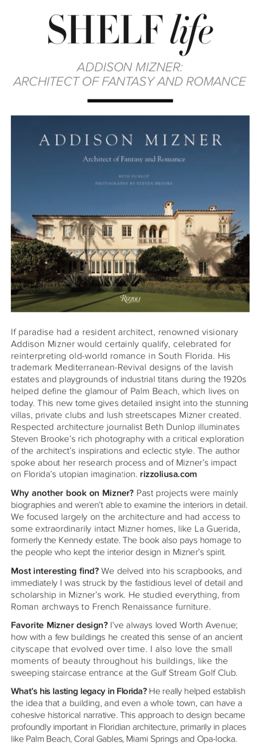 If paradise had a resident architect, renowned visionary Addison Mizner would certainly qualify, celebrated for reinterpreting old-world romance in South Florida. His trademark Mediterranean-Revival designs of the lavish estates and playgrounds of industrial titans during the 1920s helped define the glamour of Palm Beach, which lives on today. This new tome gives detailed insight into the stunning villas, private clubs and lush streetscapes Mizner created. Respected architecture journalist Beth Dunlop illuminates Steven Brooke’s rich photography with a critical exploration of the architect’s inspirations and eclectic style. The author spoke about her research process and of Mizner’s impact on Florida’s utopian imagination.