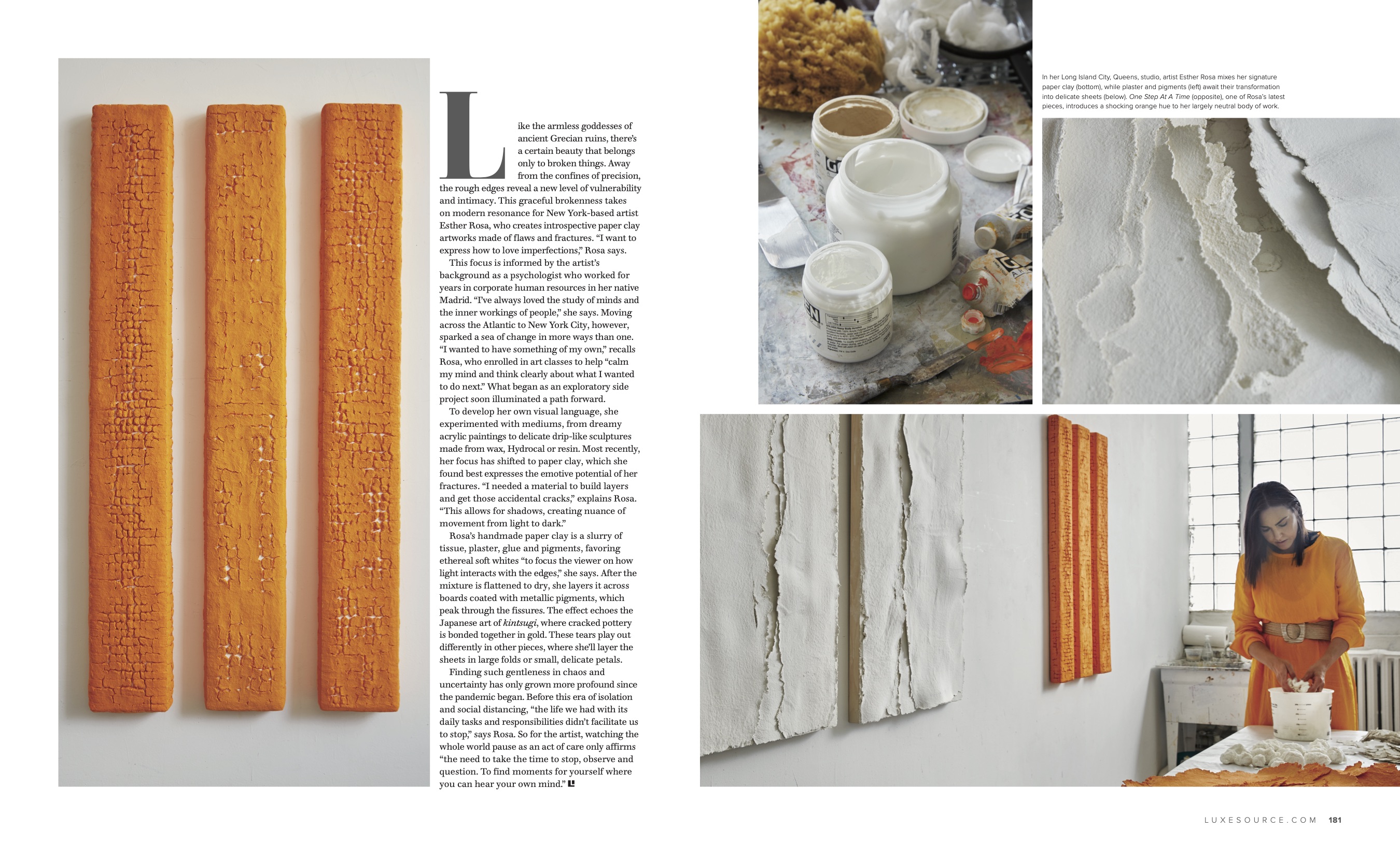 Like the armless goddesses of ancient Grecian ruins, there’s a certain aura that belongs only to beautiful, broken things. Away from the confines of precision, the rough edges reveal a new level of vulnerability and intimacy. This graceful brokenness takes on modern resonance for New York-based artist Esther Rosa, who creates introspective paper clay artworks made of flaws and fractures. “I want to express through composition and materials how to love imperfections,” Rosa says.