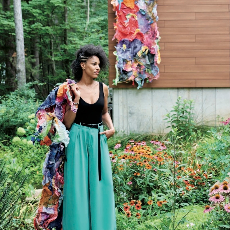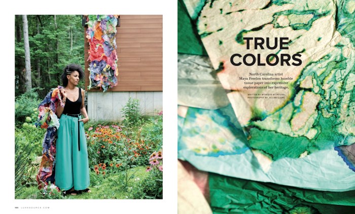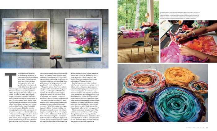 While riffling through rusted irons, antique quilts, photos of James Baldwin and Langston Hughes first editions, Freelon unearthed something that excited her: a stack of water-stained tissue papers, their hues having bled together to mesmerizing effect. Where some may have seen ruined craft supplies, Freelon found the insight that would come to define her practice: reimagining these humble watermarks for prismatic monoprints and soft sculptures.