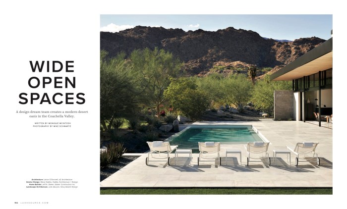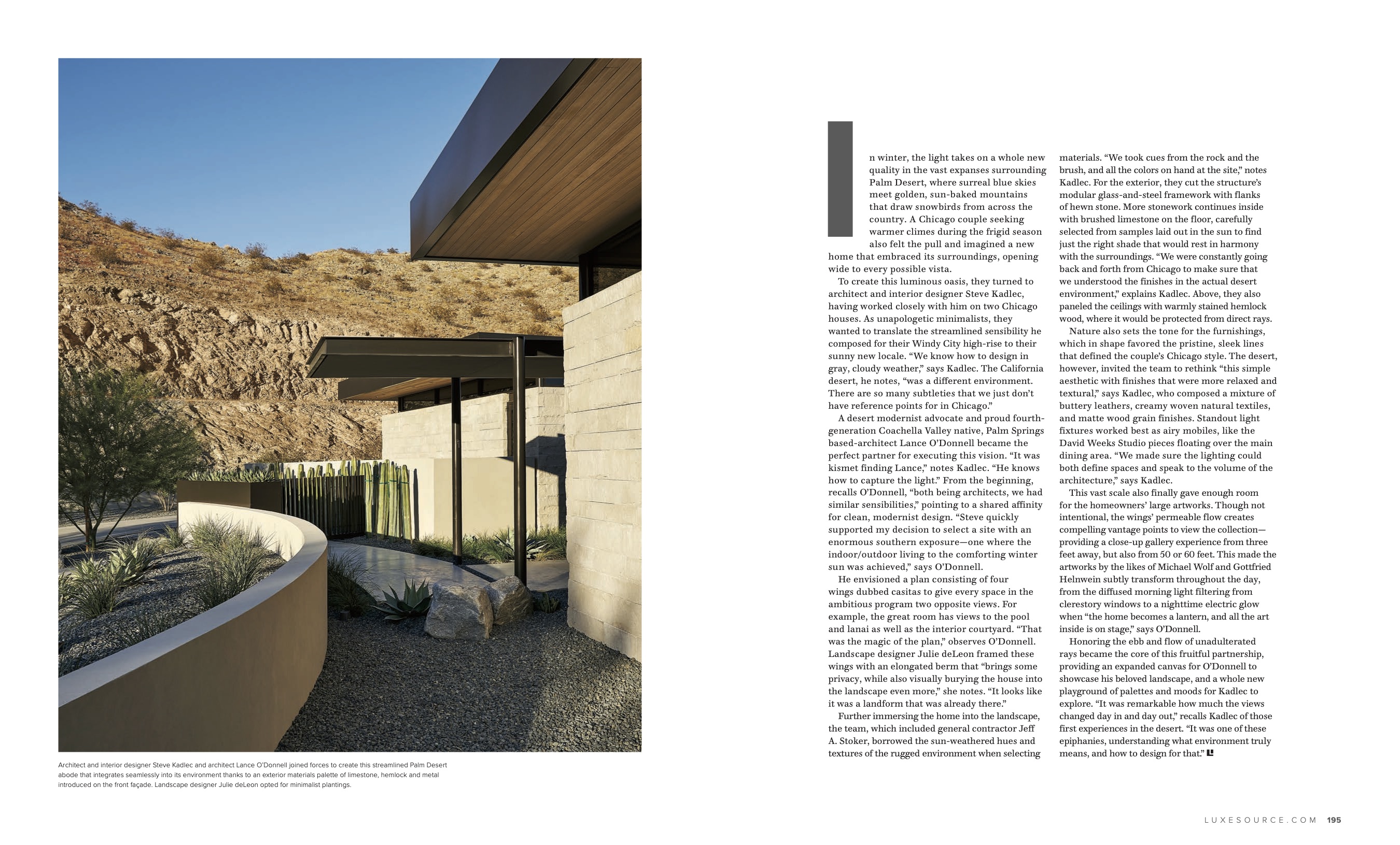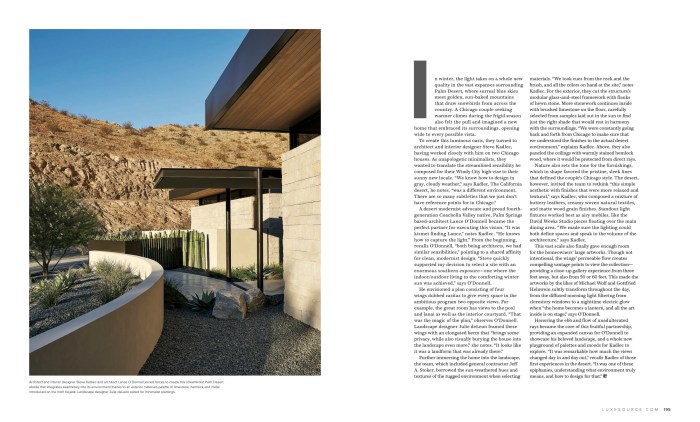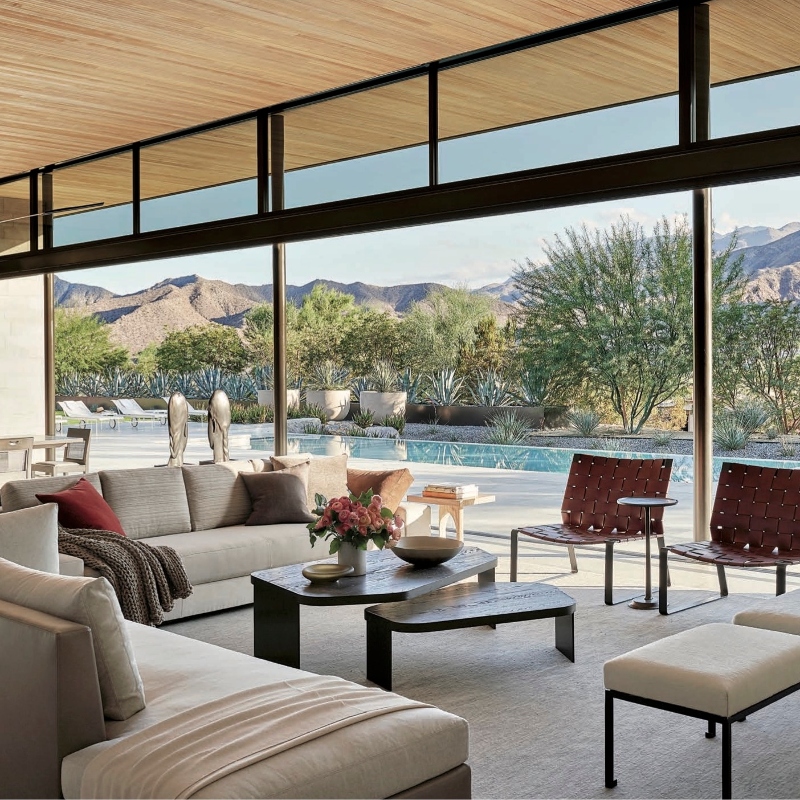 “In winter, the light takes on a whole new quality in the vast expanses surrounding Palm Desert, California, where surreal blue skies meet golden, sun-baked mountains that draw snowbirds from across the country. A Chicago couple seeking warmer climes during the frigid season also felt the pull and imagined a new home that embraced its surroundings, opening wide to every possible vista.“