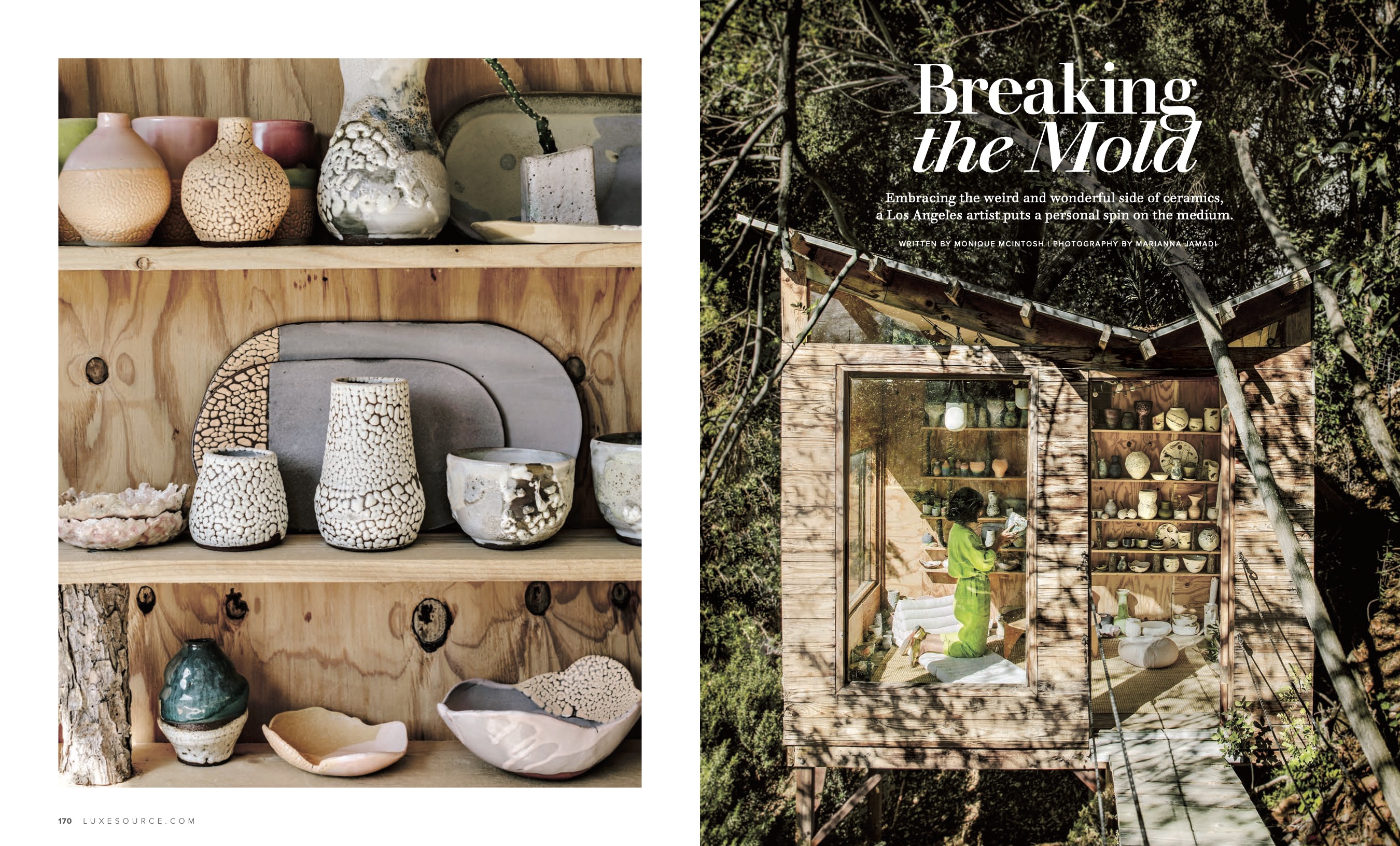 “Like a mysterious, simmering cauldron, there’s always something bubbling in ceramicist Raina J. Lee’s kiln. The results never fail to surprise, whether it’s foaming glazes that crackle like the surface of the moon or the swirls of dreamy pastels and nebula neons. The Los Angeles-based artist fully embraces her craft’s alchemical elements, reimagining classical forms with otherworldly glazes.”