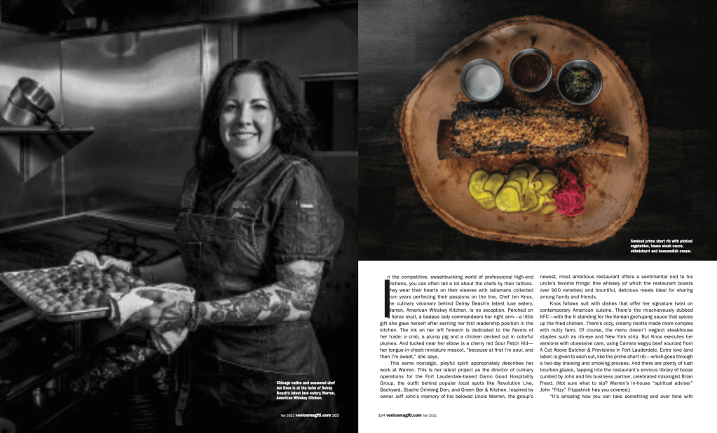 “In the competitive, swashbuckling world of professional high-end kitchens, you can often tell a lot about the chefs by their tattoos. They wear their hearts on their sleeves, with talismans collected from years perfecting their passions on the line. Chef Jen Knox, the culinary visionary behind Delray Beach’s latest luxe eatery, Warren American Whiskey Kitchen, is no exception.”