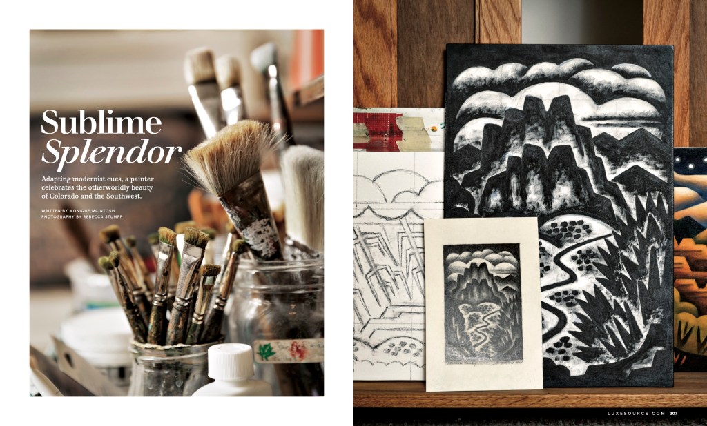 “Coloradoans are accustomed to the beautiful terrain they call home. Yet wandering among the golden Aspen forests in autumn or through the Garden of the Gods’ red rock formations, even longtime residents can still be awed. Colorado native and artist Sushe Felix captures this wonder in her paintings, which evoke the sharp geometric style of 20th-century modernism.“