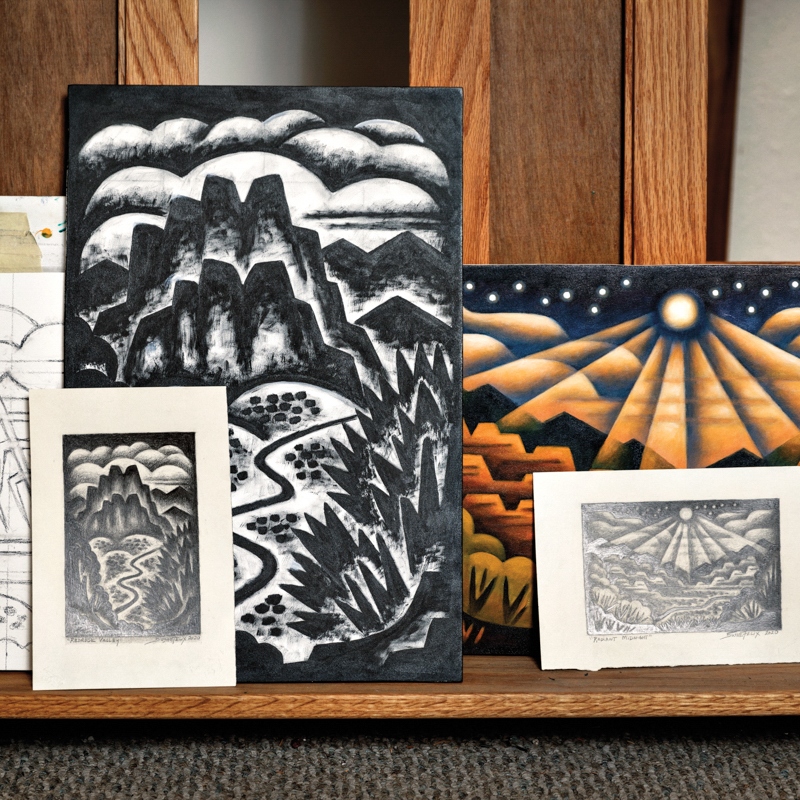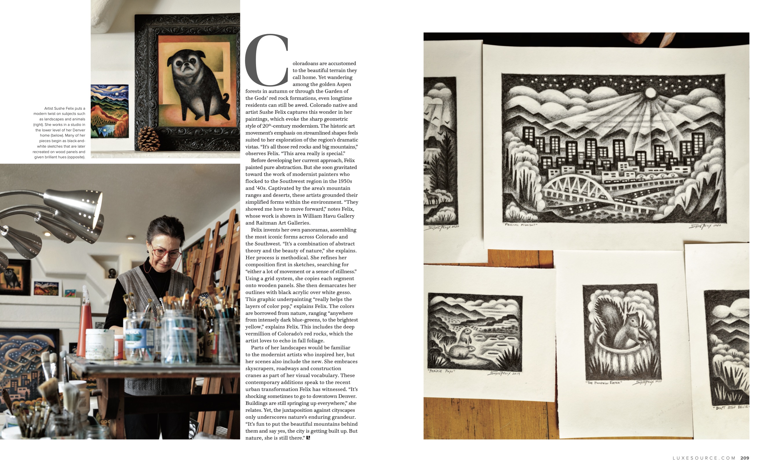 “Coloradoans are accustomed to the beautiful terrain they call home. Yet wandering among the golden Aspen forests in autumn or through the Garden of the Gods’ red rock formations, even longtime residents can still be awed. Colorado native and artist Sushe Felix captures this wonder in her paintings, which evoke the sharp geometric style of 20th-century modernism.“
