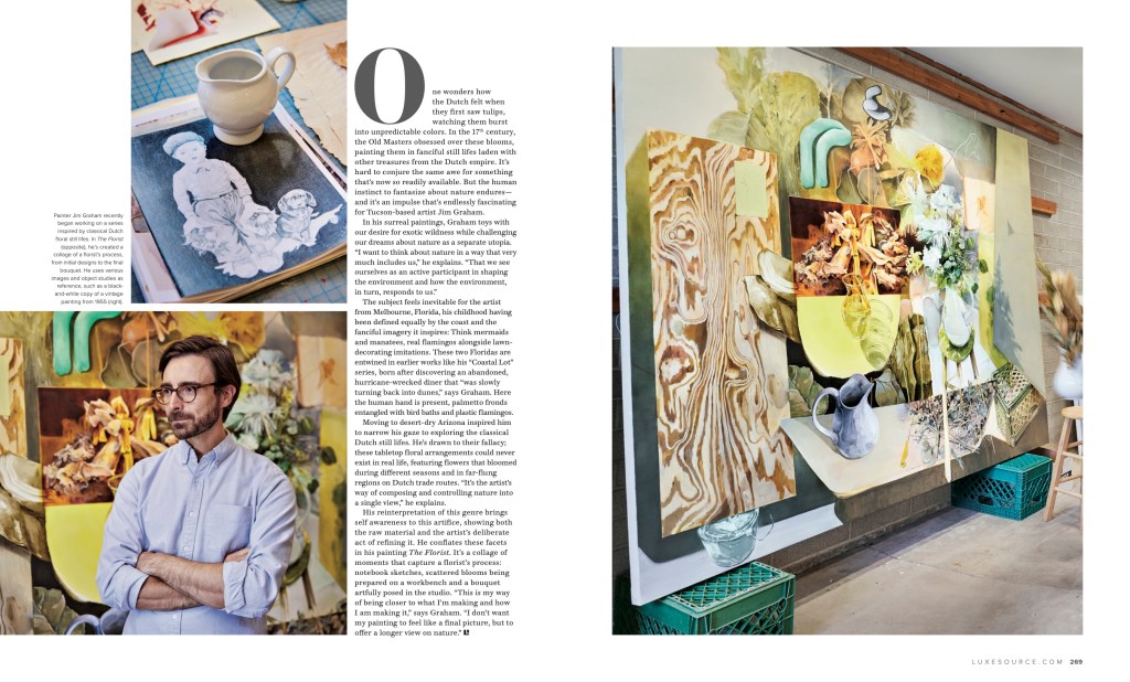 “One wonders how the Dutch felt when they first saw tulips, watching them burst into unpredictable colors. In the 17th century, the Old Masters obsessed over these blooms, painting them in fanciful still lifes laden with other treasures from the Dutch empire. It’s hard to conjure the same awe for something that’s now so readily available. But the human instinct to fantasize about nature endures — and it’s an impulse that’s endlessly fascinating for Tucson-based artist Jim Graham.“