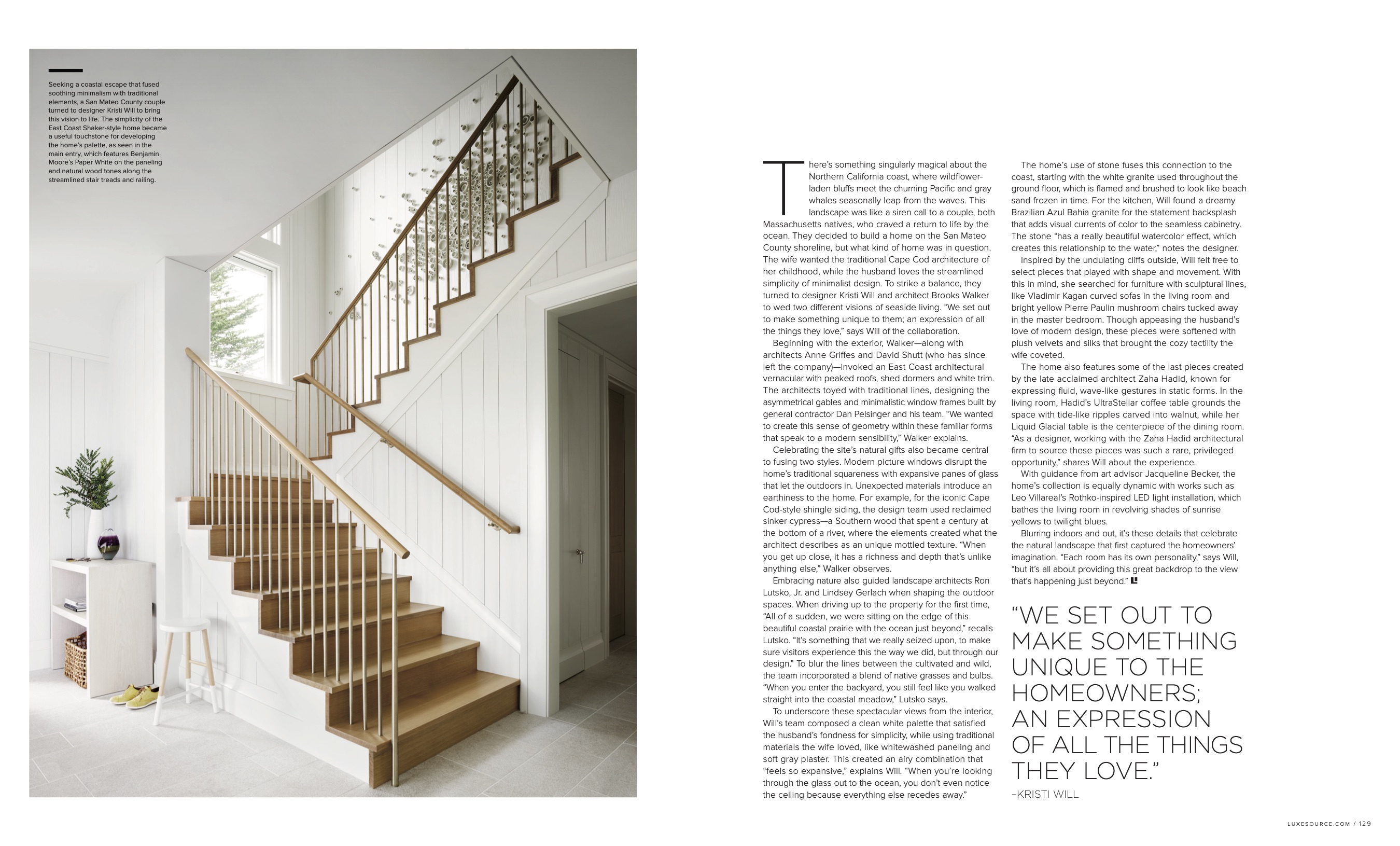 “There’s something singularly magical about the Northern California coast, where wildflower-laden bluffs meet the churning Pacific and gray whales seasonally leap from the waves. This landscape was like a siren call to a couple, both Massachusetts natives, who craved a return to life by the ocean.”