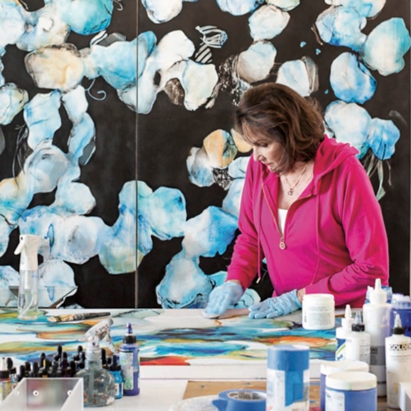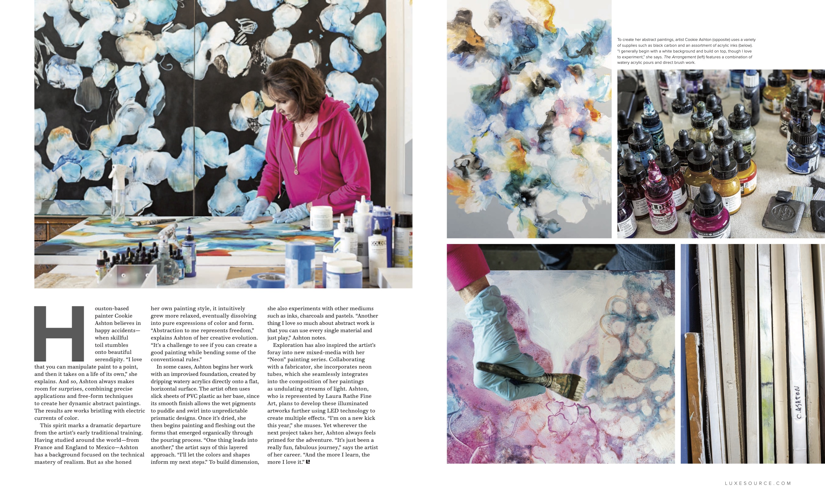 “Houston-based painter Cookie Ashton believes in happy accidents—when skillful toil stumbles onto beautiful serendipity. “I love that you can manipulate paint to a point, and then it takes on a life of its own,” she explains. And so, Ashton always makes room for surprises, combining precise applications and free-form techniques to create her dynamic abstract paintings. The results are works bristling with electric currents of color.”