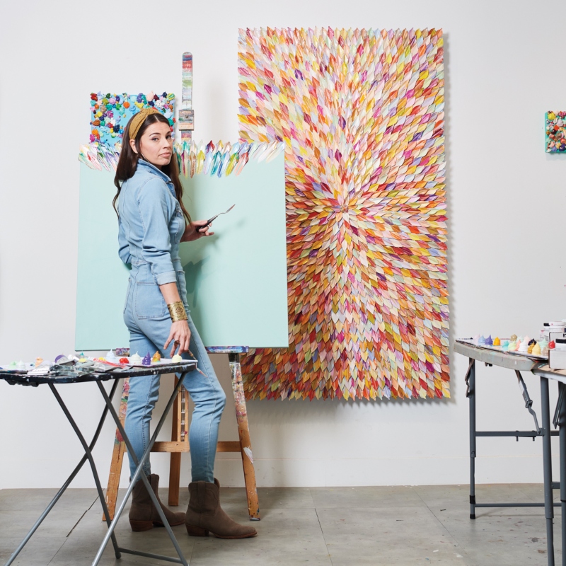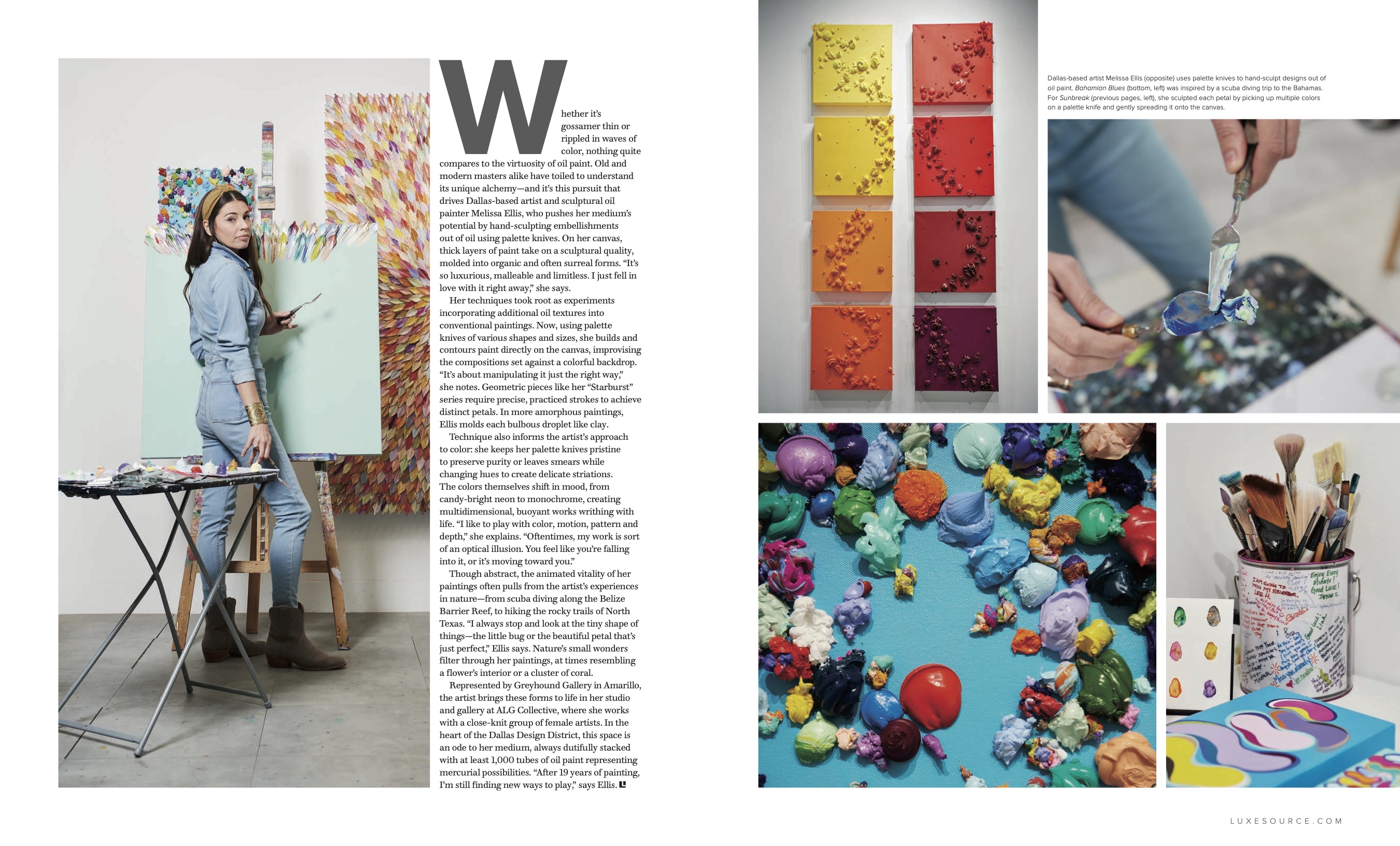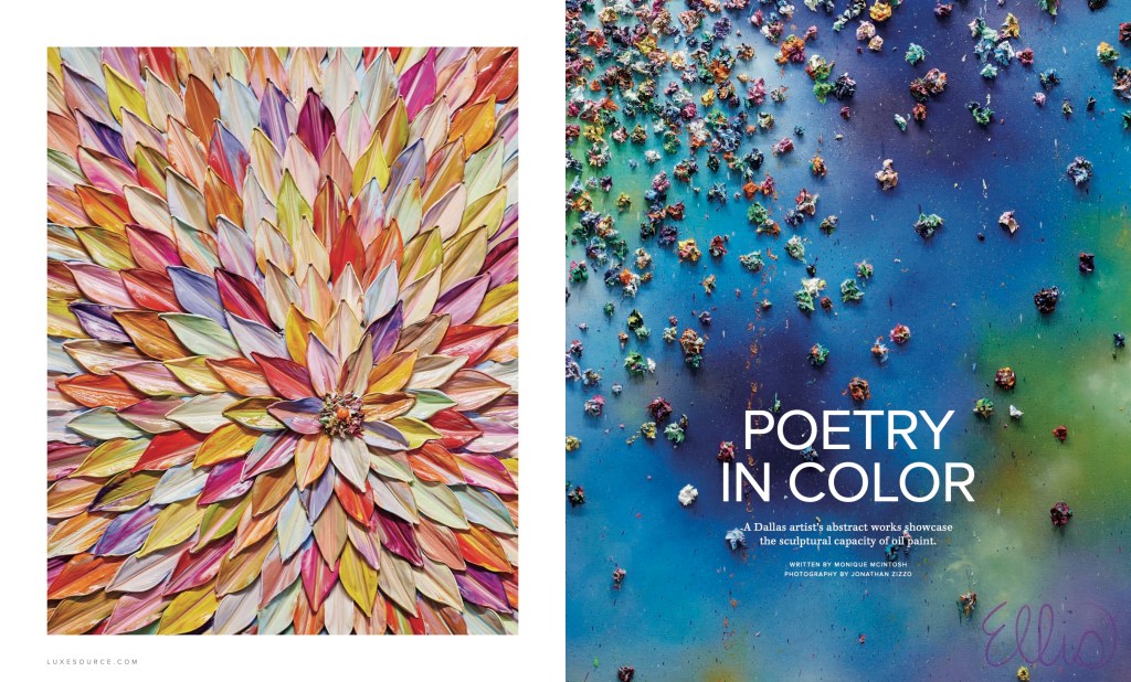 “Whether it’s gossamer thin or rippled in waves of color, nothing quite compares to the virtuosity of oil paint. Old and modern masters alike have toiled to understand its unique alchemy—and it’s this pursuit that drives Dallas-based artist and sculptural oil painter Melissa Ellis, who pushes her medium’s potential by hand-sculpting embellishments out of oil using palette knives. On her canvas, thick layers of paint take on a sculptural quality, molded into organic and often surreal forms. “It’s so luxurious, malleable and limitless. I just fell in love with it right away,” she says.”