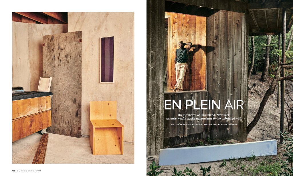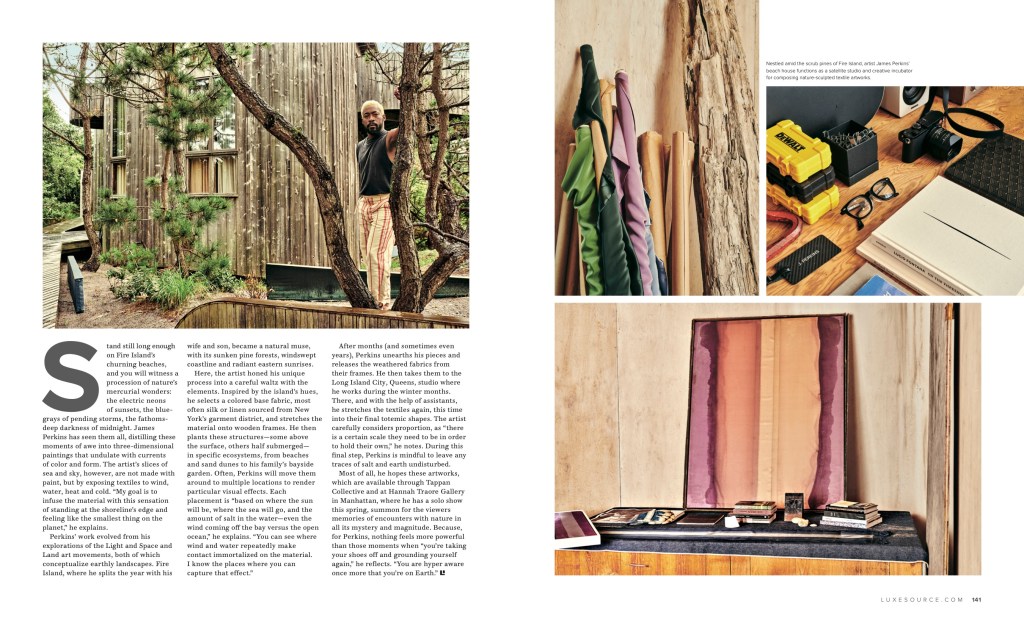 “Stand still long enough along Fire Island’s churning beaches, and you will witness a procession of nature’s mercurial wonders: the electric neons of sunsets, the blue-grays of pending storms, the fathoms-deep darkness of midnight. James Perkins has seen them all, distilling these moments of awe into three-dimensional paintings that undulate with currents of color and form. The artist’s slices of sea and sky, however, are not made with paint, but by exposing textiles to wind, water, heat and cold. “My goal is to infuse the material with this sensation of standing at the shoreline’s edge and feeling like the smallest thing on the planet,” he explains.”