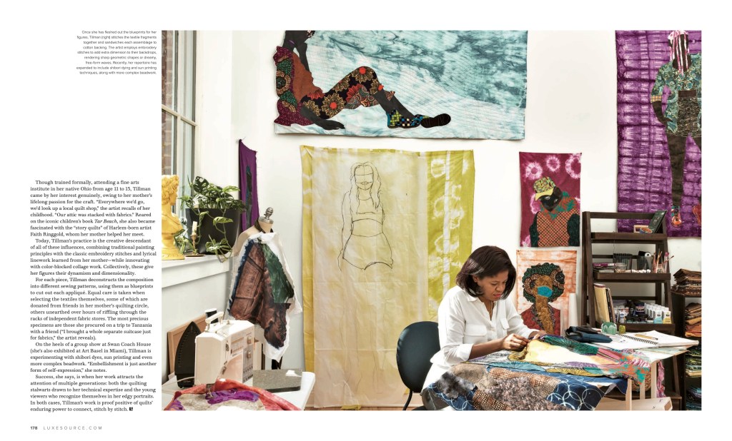 Like so many contemporary artists elevating this timeless craft to the caliber of fine art, Tillman is co-opting a rich cultural heritage to create something entirely her own. “I see quilting as an old art form translated through time,” she explains. “I’m bringing it into a more modern age, creating something we can relate to today.”